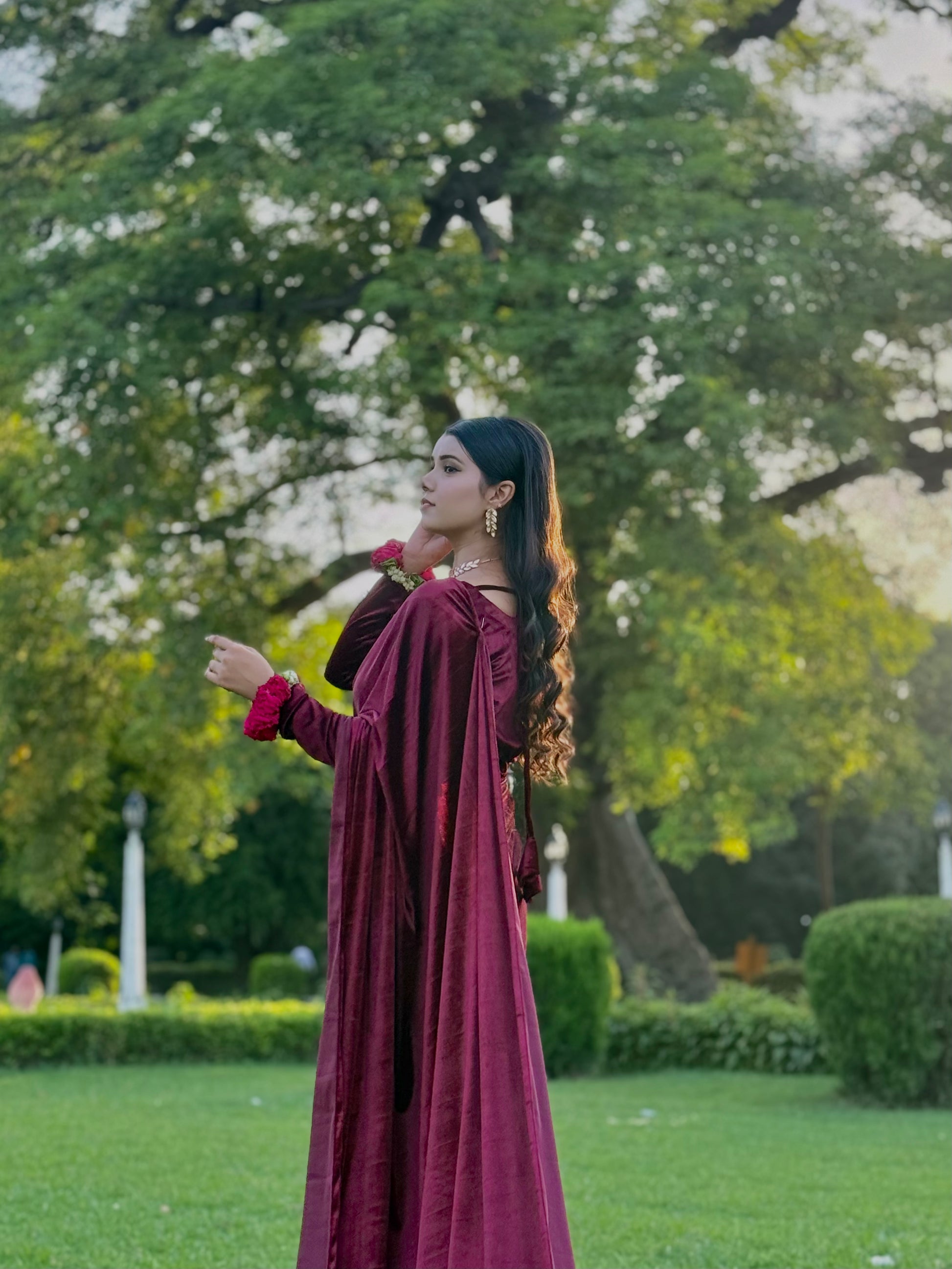 A perfect choice for winter soirées, wedding festivities, and evening glamour — this saree doesn’t just adorn you, it defines you.