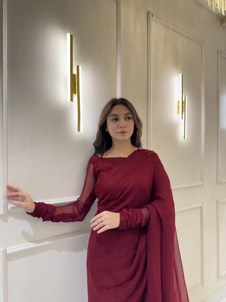 This luxurious deep garnet saree is crafted from premium Chiffon, offering a soft fall and subtle sheen that flows effortlessly with every step. The four-sided silk pallu border adds a refined touch, perfectly framing the drape for an elevated look.