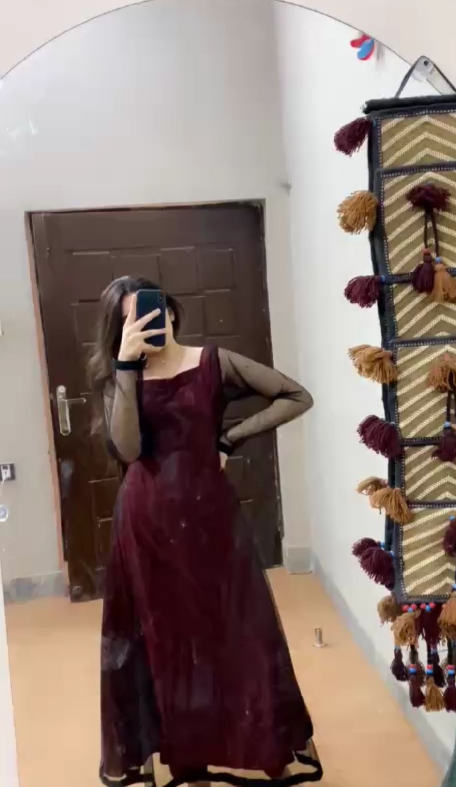 The maxi dress is tailored with a flattering square neckline, long sheer sleeves, and a fluid A-line fall that enhances your natural curves. At the back, adjustable straps ensure a perfect fit, adding both functionality and a subtle hint of allure. A matching straight-fit trouser in maroon silk completes the look, offering comfort without compromising sophistication.